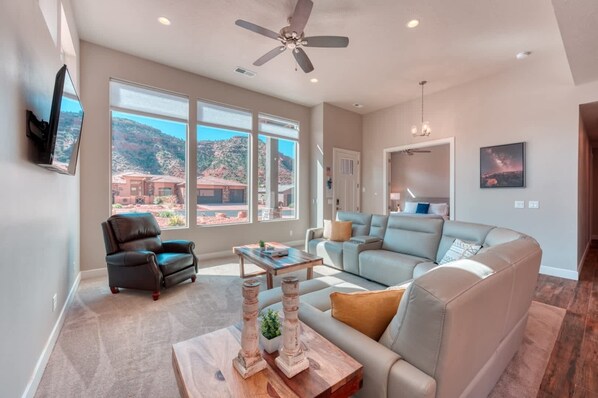 Living Area - Open floor plan, floor to ceiling windows with amazing views, large sectional sofa, recliner, Smart TV.
