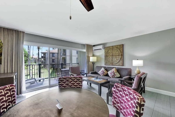 Living Space: The open concept living area is designed with relaxation in mind. Unwind on the plush sofa, watch your favorite shows on the flat-screen TV, or step out onto the private lanai to soak in the beautiful resort gardens.  The condo also features air conditioning (split AC system in living room), and high-speed Wi-Fi.  The condo has one bathroom.  The unit is not designed for accessibility, and it features a traditional step-in tub.