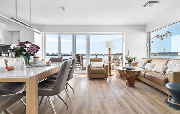 The open-plan living and dining area forms the heart of the apartment and welcomes you with floor-to-ceiling window fronts, modern maritime furnishings and a cosy sofa corner for relaxed TV evenings.