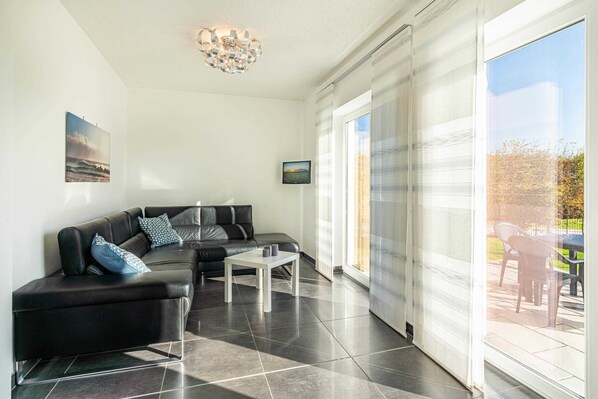 Equipment features: -1 bedroom with 1 double bed, 2 x 80 x 200 cm, -1 bedroom with 2 single beds, 90 x 200 cm, -1 living area with couch, dining area and open kitchen-1 bathroom with shower on the ground floor, -1 bathroom with Bathtub upstairs, -1 terrace with garden furniture, chargeable, voluntary optional services :. • Linen package (hand./ Duvet cover / sheets) can be rented, surcharge 15.00 Euro / per person./ per change • Domestic / small animal, surcharge 6.00 euros / per animal / per day We expressly point out that the use of the voluntary optional services is optional.