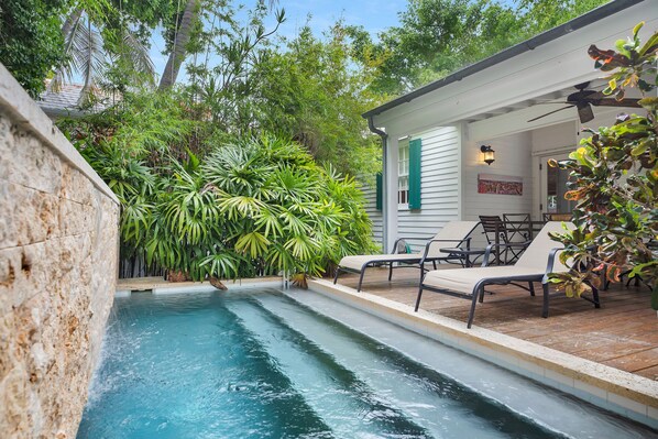 Title: LA CASITA EN CIMA~ Enjoy Key West in this lovely gem with a heated pool. Reviews, Deals & Photos 2026 - Expedia.co.uk [See all properties](http://www.expedia.co.uk/Hotel-Search?regionId=&adults=2&children=&sort=RECOMMENDED&useRewards=false&semdtl=&userIntent=&vip=false) Entire home # LA CASITA EN CIMA\~ Enjoy Key West in this lovely gem with a heated pool. Holiday home with private pool, 5-minute walk to Duval Street ## Photo gallery for LA CASITA EN CIMA\~ Enjoy Key West in this lovely gem with a heated pool. ![Pool - LA CASITA EN CIMA~ Enjoy Key West in this lovely gem with a heated pool. (Key West)](https://images.trvl-media.com/lodging/80000000/79790000/79785600/79785527/8fe6e284.jpg?impolicy=resizecrop&rw=598&ra=fit) ![Exterior - LA CASITA EN CIMA~ Enjoy Key West in this lovely gem with a heated pool. (Key West)](https://images.trvl-media.com/lodging/80000000/79790000/79785600/79785527/2194f66d.jpg?impolicy=resizecrop&rw=297&ra=fit) ![Smart TV, offices - LA CASITA EN CIMA~ Enjoy Key West in this lovely gem with a heated pool. (Key West)](https://images.trvl-media.com/lodging/80000000/79790000/79785600/79785527/b98dd9f2.jpg?impolicy=resizecrop&rw=297&ra=fit) ![Fridge, microwave, oven, stovetop - LA CASITA EN CIMA~ Enjoy Key West in this lovely gem with a heated pool. (Key West)](https://images.trvl-media.com/lodging/80000000/79790000/79785600/79785527/80f605c5.jpg?impolicy=resizecrop&rw=297&ra=fit) ![Exterior detail - LA CASITA EN CIMA~ Enjoy Key West in this lovely gem with a heated pool. (Key West)](https://images.trvl-media.com/lodging/80000000/79790000/79785600/79785527/f27e58b1.jpg?impolicy=resizecrop&rw=297&ra=fit) - Overview - Location - Amenities - Policies Located in Historic Old Town, this charming home is a short walk from Duval Street. Unwind on the inviting front porch with morning coffee or enjoy the private heated pool and covered lanai perfect for dining al fresco. ## Reviews 9.8 Exceptional ### Entire home 2 bedrooms2 bathroomsSleeps 6 ## Popular amenities - Pool - Kitchen - Washing machine - Dryer - Pet-friendly - Free Wi-Fi ## Add dates for prices Check-in Check-out Travellers ## About this property ### Entire place You'll have the entire home to yourself and will only share it with other guests in your party. ### LA CASITA EN CIMA\~ Enjoy Key West in this lovely gem with a heated pool. MONTHLY RENTAL: Requires a minimum stay of 28 nights occurring within the same month. Stay a month and live like a local! THE PROPERTY: Located less than two blocks from Duval Street, this fully renovated home in Historic Old Town is walkable to many of the island’s attractions, including restaurants, bars, and shops. A 2016 recipient of The Historic Florida Keys Foundation’s Preservation Award, this home has been updated with the modern amenities of a luxury vacation home while maintaining much of its architectural detail. The inviting front porch is a wonderful place to enjoy morning coffee or people watching. After a day on Duval Street, you will enjoy kicking back and unwinding in the living room with a flat screen TV. A white kitchen with plenty of counter space, cabinets and a farmhouse sink make snack or meal preparation a breeze. Groceries and sundries may be purchased at the unique Fausto’s Market, just a three-block walk or bike ride away. Each bedroom has two closets, night tables and bedside lighting. The primary bedroom has a private entrance and a vaulted ceiling that adds volume to the space. The primary ensuite bathroom has natural light and includes a double vanity and a frameless, walk-in shower. The secondary bedroom includes a charming window seat, perfect for evening reading. Its bathroom has a tub/shower combination, pedestal sink, and a large, frosted window. Light and bright both inside and out, this home is fenced, landscaped, and adorned with a private heated pool with waterfall feature. A covered lanai and decking will inspire you to entertain or dine al fresco. A large retractable awning provides an additional dining space or a respite from the Florida sun. Hardwood floors, central air conditioning, a mini-split in the primary bedroom, and ceiling fans add to the cool convenience of this Key West style home in paradise. BED CONFIGURATION: There is a primary king bedroom, a secondary queen bedroom and a queen sleeper sofa for an occasional guest or children. OUTDOOR AMENITIES: The home is fenced, and the outdoor area is private. The pool is heated seasonally (November through April) for an additional fee which will be assessed at the time of booking. A covered lanai, loungers, outdoor seating, dining tables, electric grill and a Zen like garden complete the area. PARKING: There is no designated parking however on street parking may be available in the neighborhood. LOCATION: Old Town Key West, just 2 blocks from Duval Street. PETS: One (1) dog allowed, up to 25 lbs, for an additional fee and completion of Pet Information addendum. Must be 1 year of age or older. Must be spayed/neutered. All vaccinations must be up to date. Please be advised some breeds are not permitted. Sorry, cats are not allowed. SMOKING: This is a non-smoking home and property. \*\*\*Guests must be 25 years of age or older unless accompanied by an adult. \*\*\*Please note that the cleaning fee includes a full "mid-stay" clean\*\*\* \*\*\*Managed by Historic Key West Vacation Rentals\*\*\* ## Property amenities ### Pool/Spa - Private pool ### Internet - Available in the house: Free WiFi ### Kitchen - Coffee/tea maker - Cookware, dishware, and utensils - Dishwasher - Hob - Microwave - Oven - Refrigerator - Toaster ### Dining - Dining table ### Bedrooms - 2 bedrooms - Bedsheets provided - Sofa bed ### Bathroom - 2 bathrooms - Bathtub or shower - Hair dryer - Shower - Towels provided ### Living spaces - Dining table - Living room ### Entertainment - Smart TV with cable/satellite channels ### Outdoor areas - Barbecue grill - Fenced yard - Garden - Patio ### Laundry - Laundry fa
