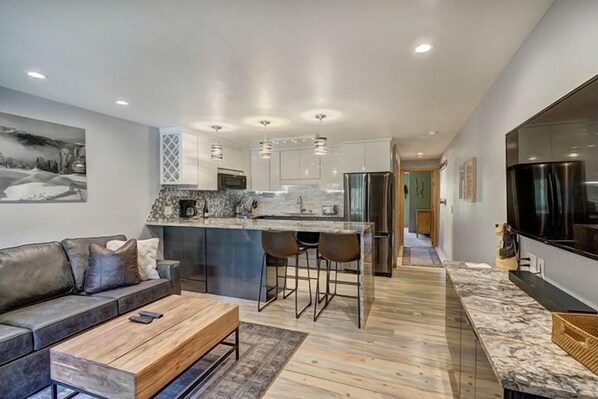 1 Bedroom, 1 Bath offers a cozy and convenient mountain retreat with beautiful views of the surrounding peaks. This well-appointed unit includes free WiFi, parking, and a full kitchen equipped with a dining table and everything you need to prepare gourmet meals. Relax in the cozy living area on one of the comfortable sofas in front of the fireplace. This condo has a variety of bedding configurations and can comfortably sleep up to 4 guests.