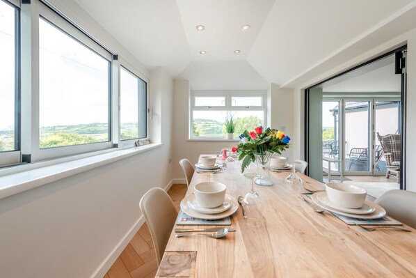 Step into this warm, welcoming property and find yourselves instantly drawn into the inviting lounge/diner, where neutral tones and soft lighting set a relaxing atmosphere from the get-go. After long beach adventures, unwind on the sofas, light the wood burner, and gather around the dining table for long, laughter-filled meals and games nights. Next door, there’s a separate snug complete with a sofa and Smart TV, which is the ideal space for kids to escape to when the adults are chatting. The galley kitchen is stylish and fully equipped for group cooking sessions, and it flows through to a bright conservatory space with a large table and chairs, where guests can serve up tipples and nibbles. Finally, a handy utility room and a shower room with a WC complete the downstairs. Upstairs, you’ll find five bedrooms, including a two charming king size bedrooms (one with a ensuite shower room), two bunk-bedded rooms ( one suitable for little ones only), bunk bedded room with a double bed at the base. All bedrooms are decorated in calming hues for a peaceful night’s sleep. There’s also an additional shower room with a WC to keep the morning routine stress-free.