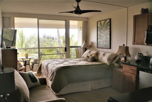 The studio lock-off (when available) has been remodeled including a new Cal king bed, a small kitchenette and a newly remodeled modern bathroom. It also has it's own lanai, AC, fan and TV. You'll look forward to waking up each morning to spectacular views. (The last 6 pictures are of the studio.)
