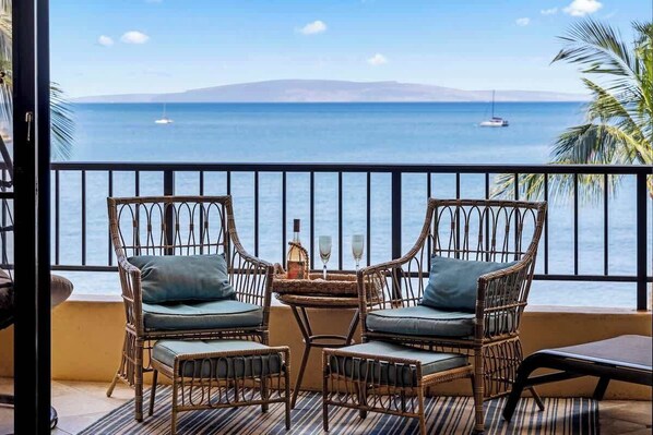 Oceanfront lanai for two with table and egg swing, perfect for morning coffee or sunset cocktails.