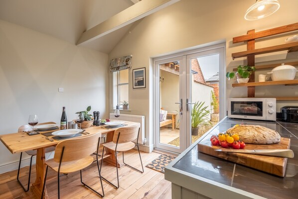 With a choice of two sitting areas, one to the front of the house and another to the rear, guests can spread out and easily find a peaceful spot to themselves if they so desire. The open-plan living/sitting and dining area is a good sociable space, where french doors can be opened to the courtyard garden when the days are sunny and warm, and an open fire to light when the nights draw in. The three bedrooms (king-size, double and single), set around a large landing area, are found on the first floor, along with two bathrooms, one of which is en-suite and has a joyous roll top bath for the ultimate indulgent soak after a busy day out exploring under Norfolk's renowned big blue skies.