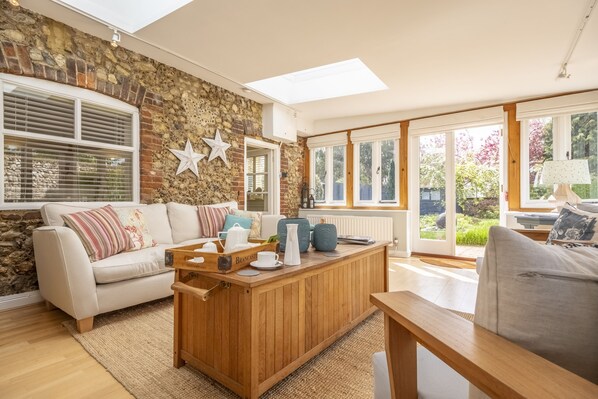 Step inside this comfortable and spacious brick and flint semi-detached cottage and you will feel at home instantly. The large farmhouse-style contemporary dining kitchen is extremely well-equipped and stylish, as is the remainder of the cottage. With a large hallway with wood burning stove, stylish sitting room leading onto a large spacious garden room with lots of light, it was originally the dairy for Pond Farmhouse next door. Now a stylish holiday home, this delightful property has certainly retained its character. What it doesn't do though is skimp on style; and the two bedrooms; which feature a king-size bed and super-king zip and link bed, come with comfortable deep hotel-style mattresses with quality Egyptian cotton linens, soft duvets, plump pillows and fluffy towels to make your stay special and to enhance your relaxation. Two well-appointed en-suite shower rooms make this special homestay complete.