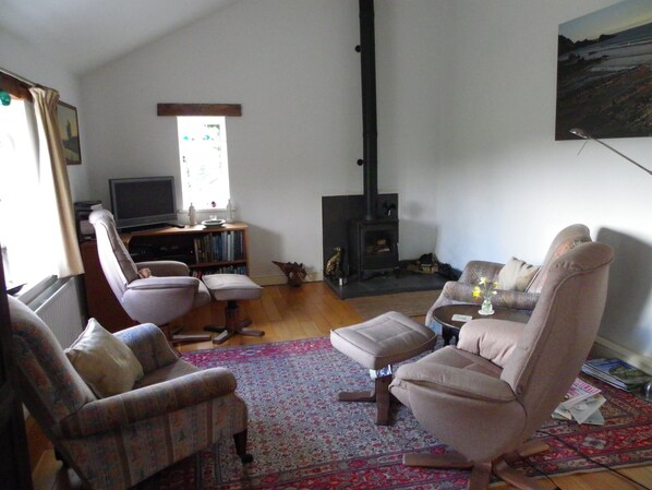 The ground floor features a large sitting room with wood burner stove, TV and DVD , a study with a double futon for occasional use and a family bathroom with a wash basin, wc and bath.