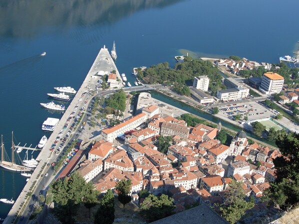 It is just a few metres walk to visit the many museums, churches, restaurants, bars, and shops within the picturesque and car (exhaust) free old town (parking available outside just 150-250 metres away). Or take the 30 minutes’ walk up to the top of the old fort with breath-taking views of the Boka Bay. The waterfront lined by yachts and boats is just 2 minutes’ walk and walking a little further brings you to Dobrota, with waterfront restaurants and swimming in the clear Boka Bay water. Inexpensive buses or taxis can take you to historic and unspoilt Boka Bay villages (Prcanj, Perast etc.), or further on to the more developed Budva (with its own scenic old town, bungee jumping, water sports, etc.) or to sandy and rocky beaches directly on the Adriatic coast (Jaz, Blue Horizons, etc.). A boat trip around the bay, and especially to the island worth the church on is not to be missed. Altogether this UNESCO world heritage town and area is a dramatic, interesting and unforgettable area to experience.