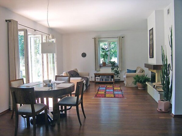 5-room house 160 m2. Open living/dining room 30 m2 with open-hearth fireplace, satellite TV, radio, hi-fi system and DVD. Exit to the garden, to the terrace. Lounge 30 m2 with library. Open kitchen 12 m2 (oven, dishwasher, 4 ceramic glass hob hotplates). Shower/WC. Top floor: 1 room 20 m2 with 1 french bed (160 cm, length 200 cm). 1 room 20 m2 with 1 double sofabed (120 cm, length 200 cm). Exit to the balcony. 1 room with 2 beds (90 cm, length 200 cm). Bath/WC with corner bath. Gas heating, wood heating, floor heating. Terrace 40 m2, terrace 12 m2. Terrace furniture, deck chairs (3), box-room. View of the valley, the countryside and the river. Facilities: washing machine, sauna. Internet (WiFi, free). Garage (2 cars). Please note: suitable for families. Smoke alarm. Additional mattress 90x200 and bedding available. The house also has a study room (12 m2) with a library.