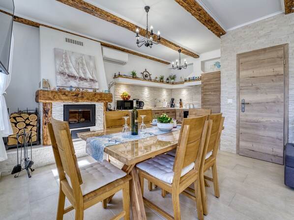 Single-family house "Old Queen", 2 storeys. In the hamlet Šmrika 5 km from the centre of Kraljevica, 4 km from the centre of Jadranovo, 800 m from the sea, 4 km from the beach. Private: property (fenced). Terrace (26 m2), garden furniture, barbecue. In the house: washing machine. Parking (for 2 cars) at the house. Grocery 450 m, supermarket 10 km, shopping centre 11 km, restaurant 450 m, bus stop 200 m, shingle beach 4 km, rocky beach 4 km. Children's playground 400 m. Nearby attractions: Donkey Farm 1 km, Kartodrom Bura 1 km, Biserujka Cave 15 km. Please note: airfield 8 km from the property. 3-room house 95 m2 on 2 levels. Fully renovated in 2024: living/dining room with 1 sofabed (90 cm, length 200 cm), open-hearth fireplace (only for decoration), dining table, cable TV and air conditioning. Open kitchen (oven, dishwasher, 2 induction hot plates, toaster, kettle, microwave, freezer, electric coffee machine). Sep. WC. Floor heating, forced-air heating. Upper floor: entrance hall with air conditioning. 1 room with 2 beds (90 cm, length 200 cm), cable TV. 1 room with 1 double bed (160 cm, length 200 cm), cable TV. Shower/WC. Facilities: Internet (WiFi, free).