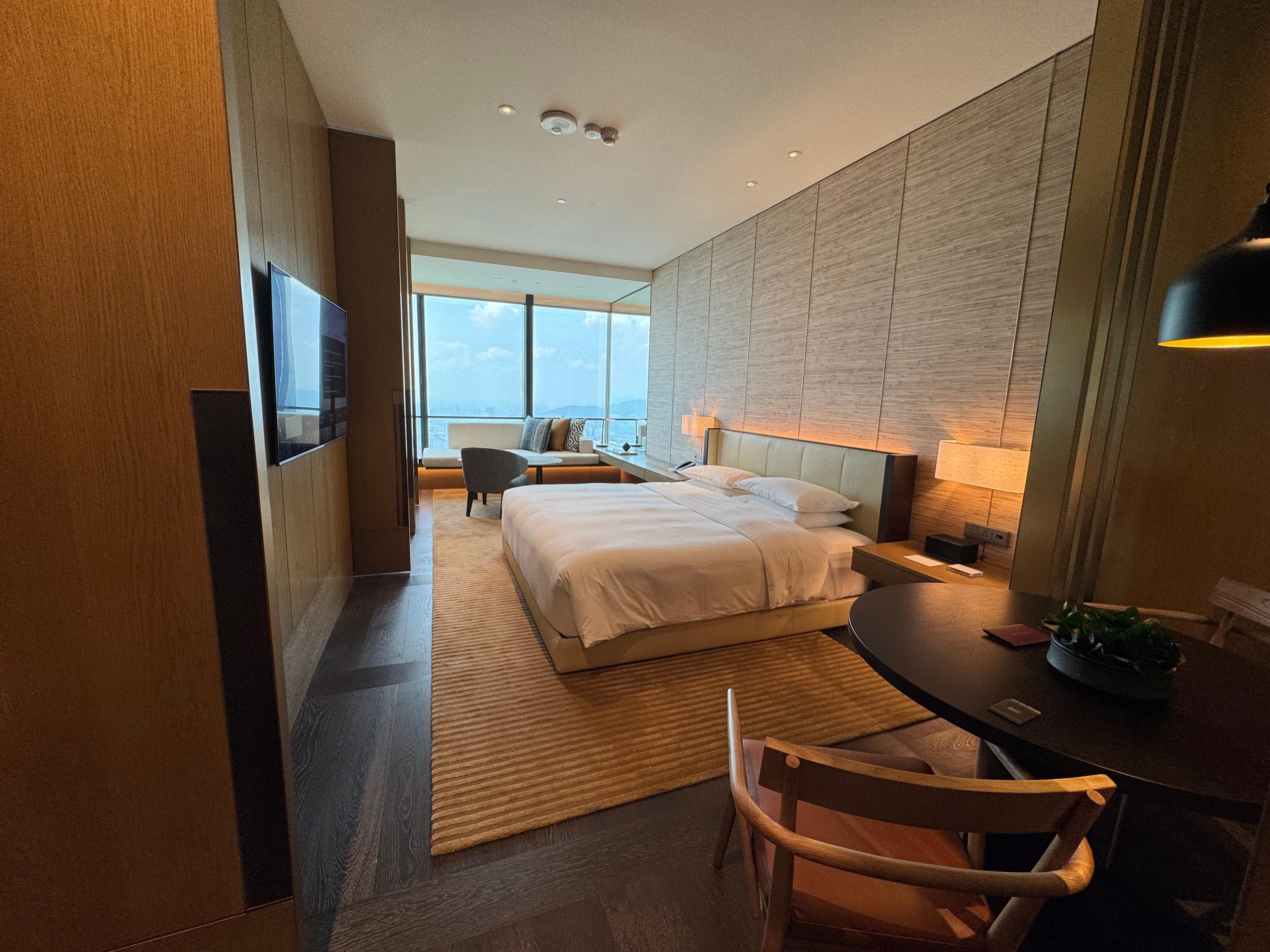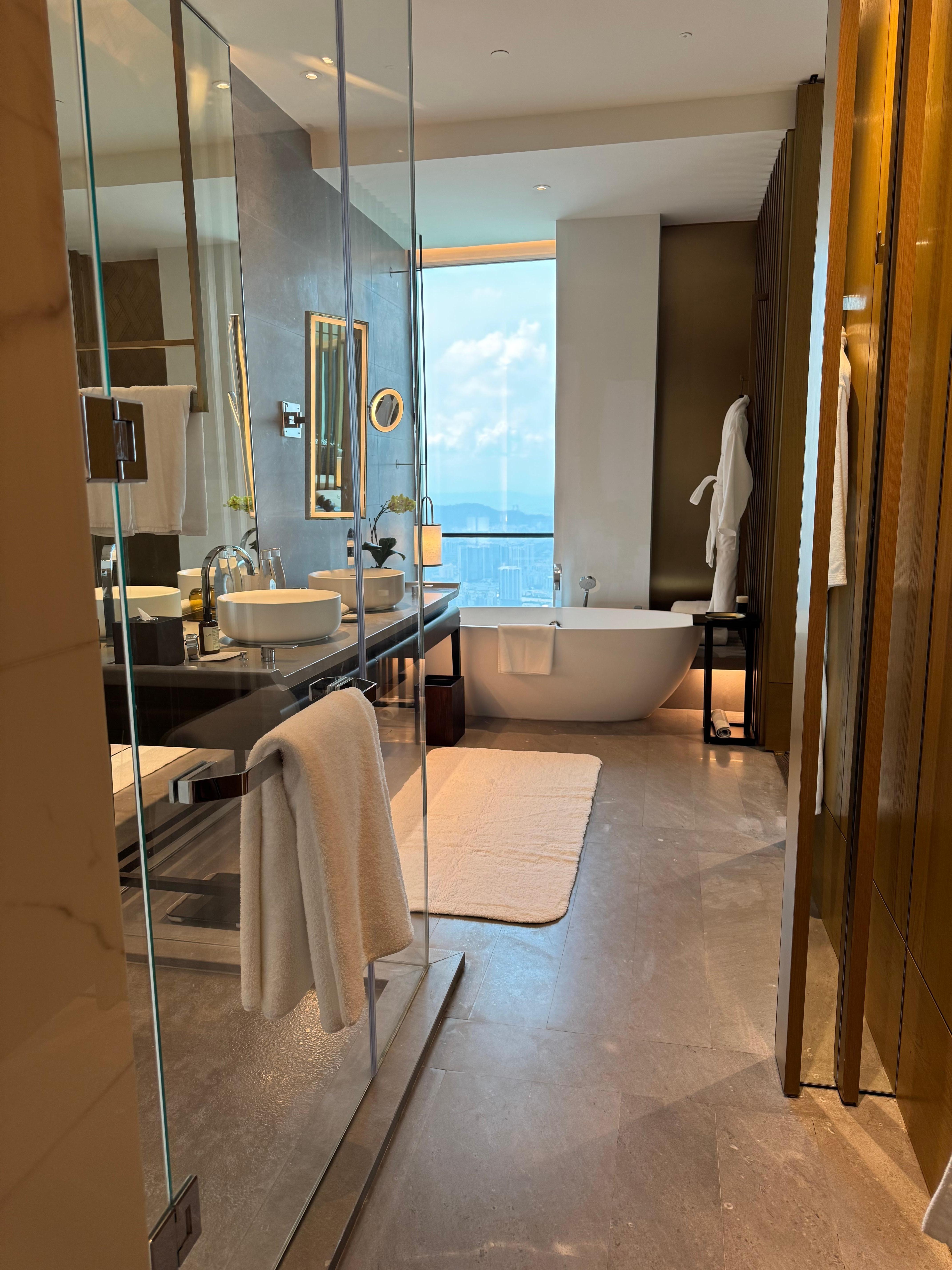 Excellent place to stay in KL: great view, superb amenities, central location, etc. We stayed at floor 109 and had excellent view of the city from the bedroom and bathroom. Got upgraded to corner king room which was very very spacious, with separate foyer, bathroom area, storage area had ironing board, safety box, dyson hair dryer. Enough space on the living room to do work from the desk, and do yoga while facing the sky high view of the city. Felt unreal when you first stepped into the room. Bathroom has super gorgeous and spacious bath tub with modern blind, lamp, water fountain etc, all facing the gigantic window. Park lounge has excellent breakfast. Service was great. Definitely a recommend, especially after the mall and MRT will be open next year