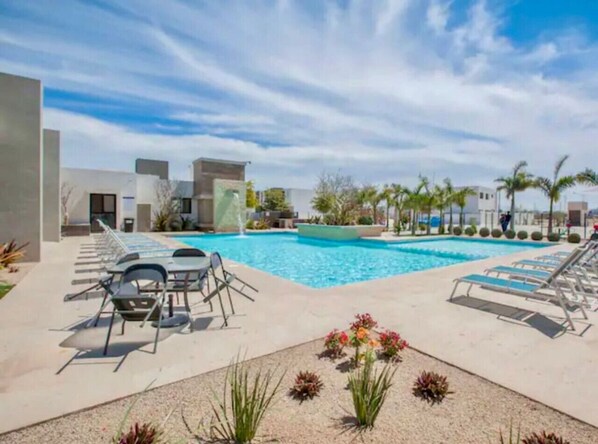 Located in a private, gated community, this 3-bedroom home offers luxurious amenities like a rooftop with sunset views, private pool and BBQ. Unwind by the cozy fire pit or enjoy family time in the backyard with Bluetooth speakers.