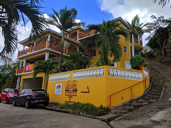 When we arrived some guy helped us with our Luggage to our room gave us the key and stated that someone will be with us. No one come to check on us or gave us any information we were on our way to dinner when we saw 2 ladies on the balcony having a conversation one of then said oh hi i'm the owner and i was just coming over to you. We went out to dinner came back there was no water to take a shower. The next day the water was just a trickle so we went to the beach for couple of hours came back the water was gone. The owner came knocking on the door stated the plummer is working on the water it will soon be back . It took over an hour then my sister went to the owner stated we really need to take a shower 15 mins. later the water came back. Beautiful breathtaking view of Laborie beach, clean and comfy beds the Tv did not work at all. Did not like the steep hill no elevators.