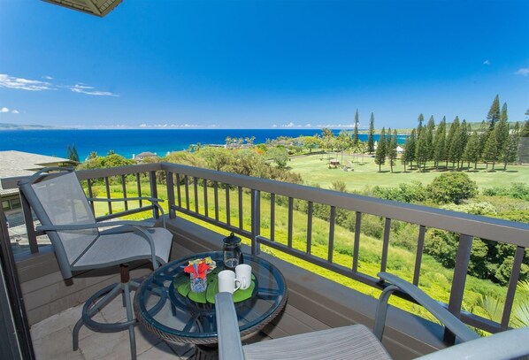 Walk through the ever-so-quiet sliding glass doors out onto your large, private lanai. Here is where you may spend most of your time, soaking in the stunning views of Kapalua and beyond. A raised table with seating for four as well as an additional raised table for two offer unobstructed views, making this spot perfect for dining alfresco, or for sharing evening cocktails. Enjoy sweeping views of the island of Moloka’i clear up the coastline to world famous surf spot, Honolua Bay.  During the winter months this is a wonderful space to watch the humpback whales at play!