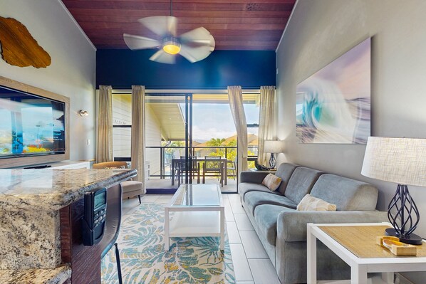 On the second floor of Mahina Surf 220, you'll find a serene oceanfront retreat. Start your day with smoothies or coffee on the private balcony, taking in views of the pool and ocean. Inside, unwind in front of a large flatscreen TV or cook up meals in the fully equipped kitchen.