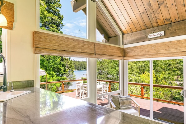 Luxurious & comfortable inside, enjoy high-end custom bedding throughout and vaulted, beamed ceilings in all main-level living areas and bedrooms. The primary suite features a fireplace and easy access to the great room, lakeview deck, and fully stocked kitchen with complete coffee bar including Nespresso, Keurig, Bialetti, brewer, grinder, milk steamer/frother etc.
