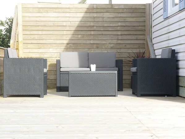 Mobilhomme All comfort, hot water, shower, heating, 1 bedroom with a double bed with wardrobe 1 bedroom with two beds with wardrobe and possibility of a bed in the living room. Bathroom shower American kitchen fitted with hob, microwave fridge, kettle, coffee maker, wooden terrace with outdoor lounge on the side of the mobile home parking for two cars, barbecue