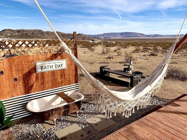 This gorgeous glamping RV rests in the beautiful sand hills of the California desert. Its stunning interior is refreshing and modern with hints of desert art and flair. Perhaps the most “Spectacular” feature is the patio. A fantastic full size swing for two, a cozy hammock and a traditional wood swing suspended just over the edge of the patio. The outdoor tub and shower is an incredible feature and a must see...A stargazer's dream and a moon like you’ve never seen.