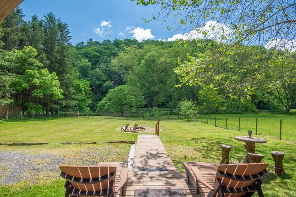 - The decks lead out to a wooden walkway that ends at an outdoor firepit. Don't forget the s'mores on your way out the door!
