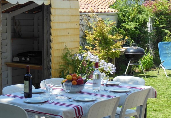 Located in a peaceful area of Cassy, the cottage allows you to enjoy the Arcachon Bay and the ocean beaches. The beach is a 15-minute walk away with its local shops and the cycle path. Built on a 600 m2 wooded and fenced garden, the house consists on the ground floor of an entrance hall, a kitchen open to the living room (insert) with direct access to the shaded terrace of 35 m2, a bedroom equipped with 1 bed 160 x 200 cm (storage), a bathroom (bathtub) and a separate toilet. Upstairs, you'll find two bedrooms: one with a 160cm bed that can be converted into two 80x200cm beds, and the other with a 90x190cm bed and a 120x190cm bed. A landing with an 80x200cm bed, a bathroom (shower), and a separate toilet complete the ensemble. The terrace is shaded by oak trees and features garden furniture and deckchairs. Direct access to the kitchen makes it easy to prepare meals between the barbecue and the gas cooktop. Parking is provided in the garden and a locked garage is available for storing surfboards, bicycles, etc. Kitchen linens and sheets are provided free of charge. Beds are made upon arrival. Free Wi-Fi. The cottage has an electric charging point for your vehicle (€30/week from June to September, and based on meter reading the rest of the year). The owners are available to stay in a studio adjoining the cottage on weekends. Electric heating is available at an additional cost, and the fireplace includes a wood-burning fireplace (free wood). Municipal reference OTCDB00360 Gas for cooking (if the cooktop uses this energy), water within reasonable consumption limits, and a flat rate of 8 kWh/day for electricity. Firewood included. Bed linens and kitchen towels provided.