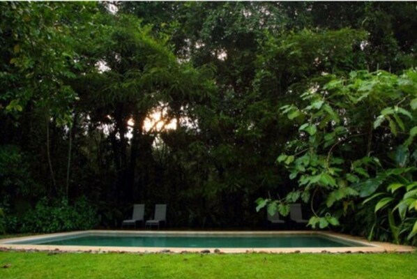 Travelers start their day in paradise at this peaceful retreat, exploring local attractions before unwinding by a beautiful, greenery-surrounded pool.