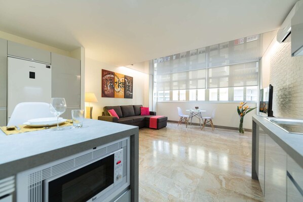 Exceptional and modern loft with capacity for 4 people. Very spacious and bright with furniture and décor designed to facilitate an enjoyable stay either for business travel, pleasure or rest. High-end mattresses with quality lingerie (cotton or Egyptian thread) and pillow menu (Latex, visco-elastic, ergonomic, etc) to make the most of your rest. Spacious living room, there is a sofa-bed (140 x 190 cm) where you can watch a TV Samsung 50" 4K SmartTV. In the kitchen you will find a complete equipment both home appliances and fixtures and utensils (Nespresso coffee machines and traditional, oven, microwave, fridge, induction, etc). Excellent location given that is located just 50 metres from Las Canteras Beach and 100 metres from the shopping center, financial and main city leisure (terraces, restaurants, shops, El Corte Inglés, golf, paddle, auditorium). New construction (2016). It has free safety box and high speed WI-FI internet access.