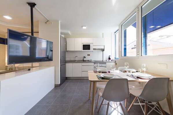 Studio Apartment Entire apartment · 1 bedroom · 1 living room · 1 bathroom · 1 kitchen · 50m² 2 beds (1 double, 1 double sofa bed) Exceptional and modern loft with capacity for 4 people. Very spacious and bright with furniture and décor designed to facilitate an enjoyable stay either for business travel, pleasure or rest. High-end mattresses with quality lingerie (cotton or Egyptian thread) and pillow menu (Latex, visco-elastic, ergonomic, etc) to make the most of your rest. Spacious living room, there is a sofa-bed (140 x 190 cm) where you can watch a TV Samsung 50" 4K SmartTV. In the kitchen you will find a complete equipment both home appliances and fixtures and utensils (Nespresso coffee machines and traditional, oven, microwave, fridge, induction, etc). Excellent location given that is located just 50 metres from Las Canteras Beach and 100 metres from the shopping center, financial and main city leisure (terraces, restaurants, shops, El Corte Inglés, golf, paddle, auditorium). It has free safety box and high speed WI-FI internet access. VV-35-1-0000084
