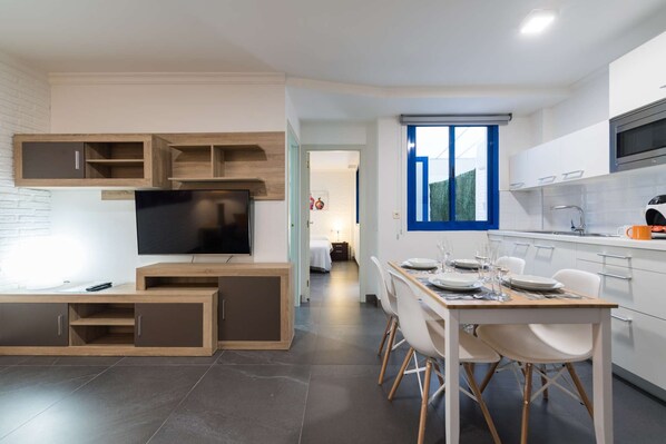 2-Bedroom Apartment Entire apartment · 2 bedroom · 1 living room · 1 bathroom · 1 kitchen · 50m² 2 beds (1 double, 1 double sofa bed and 2 singles) Exceptional and modern apartment with capacity for 4 people. Very spacious and bright with furniture and décor designed to facilitate an enjoyable stay either for business travel, pleasure or rest. High-end mattresses with quality lingerie (cotton or Egyptian thread) and pillow menu (Latex, visco-elastic, ergonomic, etc) to make the most of your rest. Spacious living room, there is a sofa-bed (140 x 190 cm) where you can watch a TV Samsung 50" 4K SmartTV. In the kitchen you will find a complete equipment both home appliances and fixtures and utensils (Nespresso coffee machines and traditional, oven, microwave, fridge, induction, etc). Excellent location given that is located just 50 metres from Las Canteras Beach and 100 metres from the shopping center, financial and main city leisure (terraces, restaurants, shops, El Corte Inglés, golf, paddle, auditorium). It has free safety box and high speed WI-FI internet access.