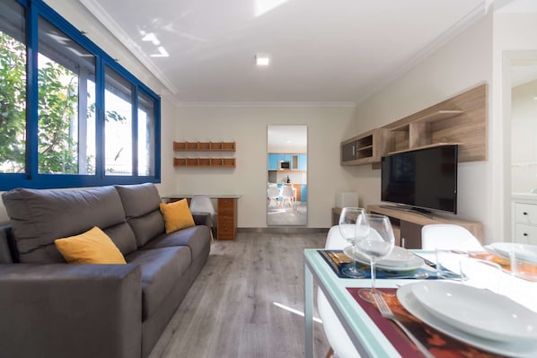 Exceptional and modern apartment with capacity for 4 people. Very spacious and bright with furniture and décor designed to facilitate an enjoyable stay either for business travel, pleasure or rest. High-end mattresses with quality lingerie (cotton or Egyptian thread) and pillow menu (Latex, visco-elastic, ergonomic, etc) to make the most of your rest. Spacious living room, there is a sofa-bed (140 x 190 cm) where you can watch a TV Samsung 50" 4K SmartTV. In the kitchen you will find a complete equipment both home appliances and fixtures and utensils (Nespresso coffee machines and traditional, oven, microwave, fridge, induction, etc). Excellent location given that is located just 50 metres from Las Canteras Beach and 100 metres from the shopping center, financial and main city leisure (terraces, restaurants, shops, El Corte Inglés, golf, paddle, auditorium). It has free safety box and high speed WI-FI internet access.