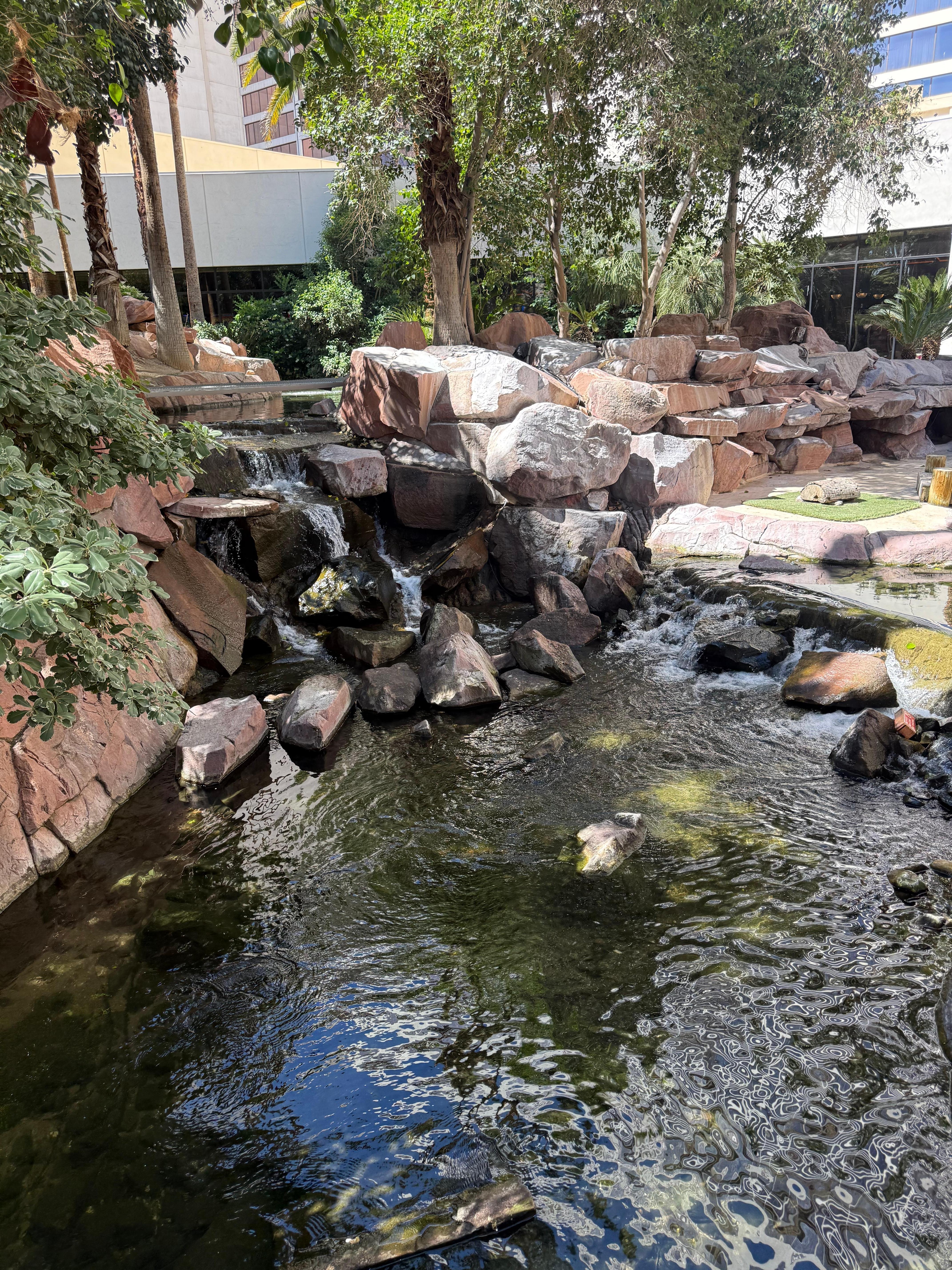Hotel is in the middle of the strip so very convenient for walking to places. The pool prices are absolutely ridiculous...not enough free loungers for everyone and the beds and cabanas are very expensive as well as the food and drinks. There were never any waitresses to get drinks when we were gambling, I felt like we always had to track someone down. The food court and coffee prices are way overpriced as well. Starbucks is double the cost as it is normally...a cheeseburger is $23. Prices are ridiculous. Rooms are nice but walls are thin as we heard a Mom yelling at her kids next door all the time.