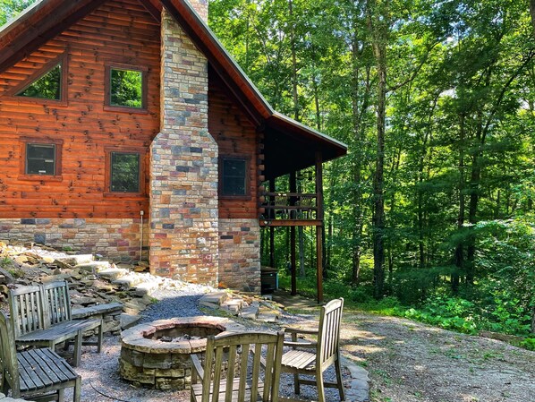 Explore the beauty of this region from the luxury of Deer Cabin, a custom built log home on 16 acres bordering state forest with wooded views from the wrap-around porch. Enjoy the fire pit under the stars, or cozy wood fire inside. Ideally located, Deer Cabin is less than a mile from Rock House State Park and 7 miles from Old Man's Cave. Perfect for romantic seclusion or playful family time: large hot tub and jacuzzi bathtub, fully equipped kitchen, and family games.