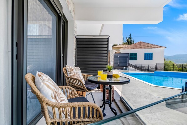 The highlight of this accommodation is its private outdoor area with a balcony. The property has access to a shared outdoor area which includes a pool, a covered terrace, a barbecue and an outdoor shower.