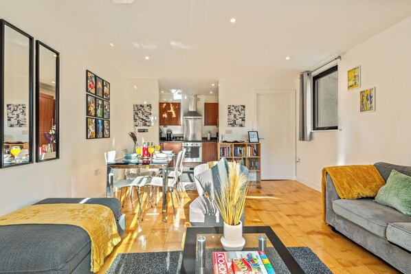 Our apartment is professionally cleaned by a cleaning team and it is designed for up to 4 guests. It features 2 stylish bedrooms (premium double bed and opulent Ottoman bed, both with smart TVs), a spacious lounge with dining area, a fully equipped kitchen (with coffee machine, dishwasher, and more), and a modern bathroom with all essentials provided. Enjoy free high-speed WiFi, Netflix entertainment, and indoor games like Monopoly and UNO.
