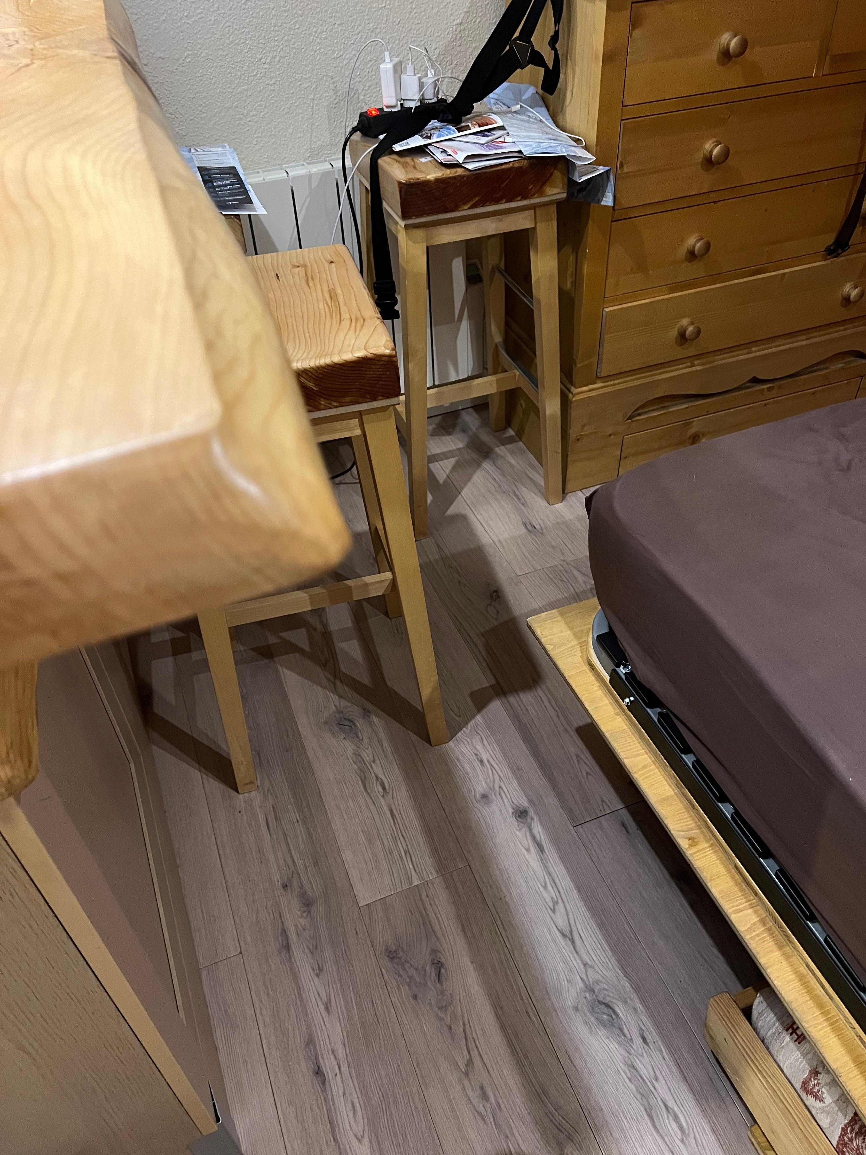 The bedding consists of a retractable bunk bed in solid spruce, including 2 beds of 80cm wide suitable for 2 children as well as a foldaway double bed also in solid spruce of 140cm. When the double bed is folded away, a sofa can be used. All the beds can be folded away leaving duvets and sheets, only the cushions must be removed also for the sofa. All mattresses are new and of high quality.