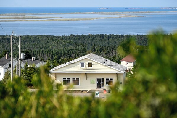 Petit hôtel offers a cozy retreat with a queen and twin bed, complete with fluffy pillows and quality linens. Your bathroom features an european-style shower, fluffy towels and Unscented Company body wash. Unwind in the common areas on the second floor featuring a fully equipped kitchen, dining room and living room with water views.
