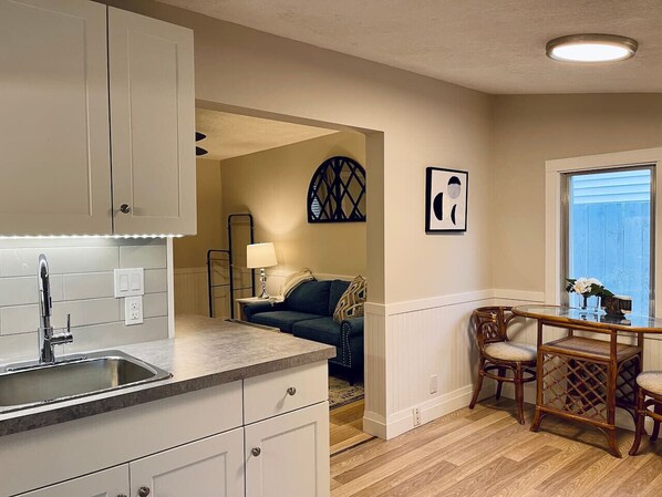 This quaint little home is entirely yours and has been remodelled to include one bedroom, living-room, a small dining area (for two), a bathroom with shower and a kitchen with cooktop. There is NO oven in this unit, but we do provide a countertop oven for basic baking and cooking. There is a two-in-one washer/dryer in the home for your use as well. They tend to take a little longer to cycle, but do a good job!