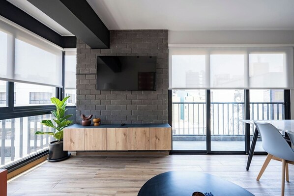 - Blackout curtains - Smart TVs in the bedroom and living room - 2 bathrooms with hot water - High-speed Wi-Fi - Equipped kitchen - On-site parking - Access to the building's common areas: Coworking space, laundry facilities, and a fully equipped gym.