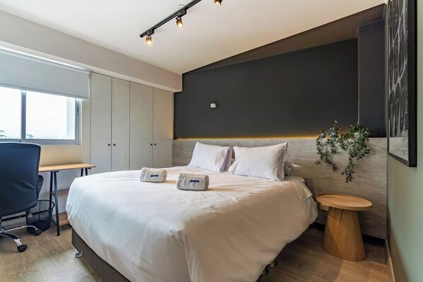 - 2 bedrooms: The main room with comfortable queen beds and the secundary with a doble bed and blackout curtains. - Smart TV - Hot water - High-speed Wi-Fi - Equipped kitchen - Full bathroom - Access to the building's common areas: rooftop pool with incredible views and a fully equipped gym.