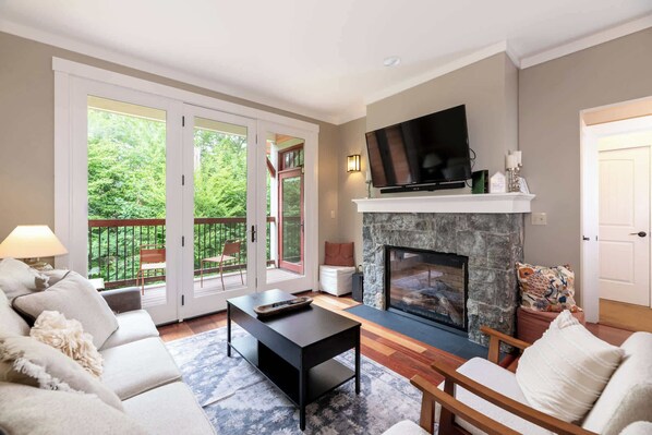 TV, fireplace, books, offices - Riverfront Condo w/ Hot Tub | River Swimming Spot! (Lincoln)