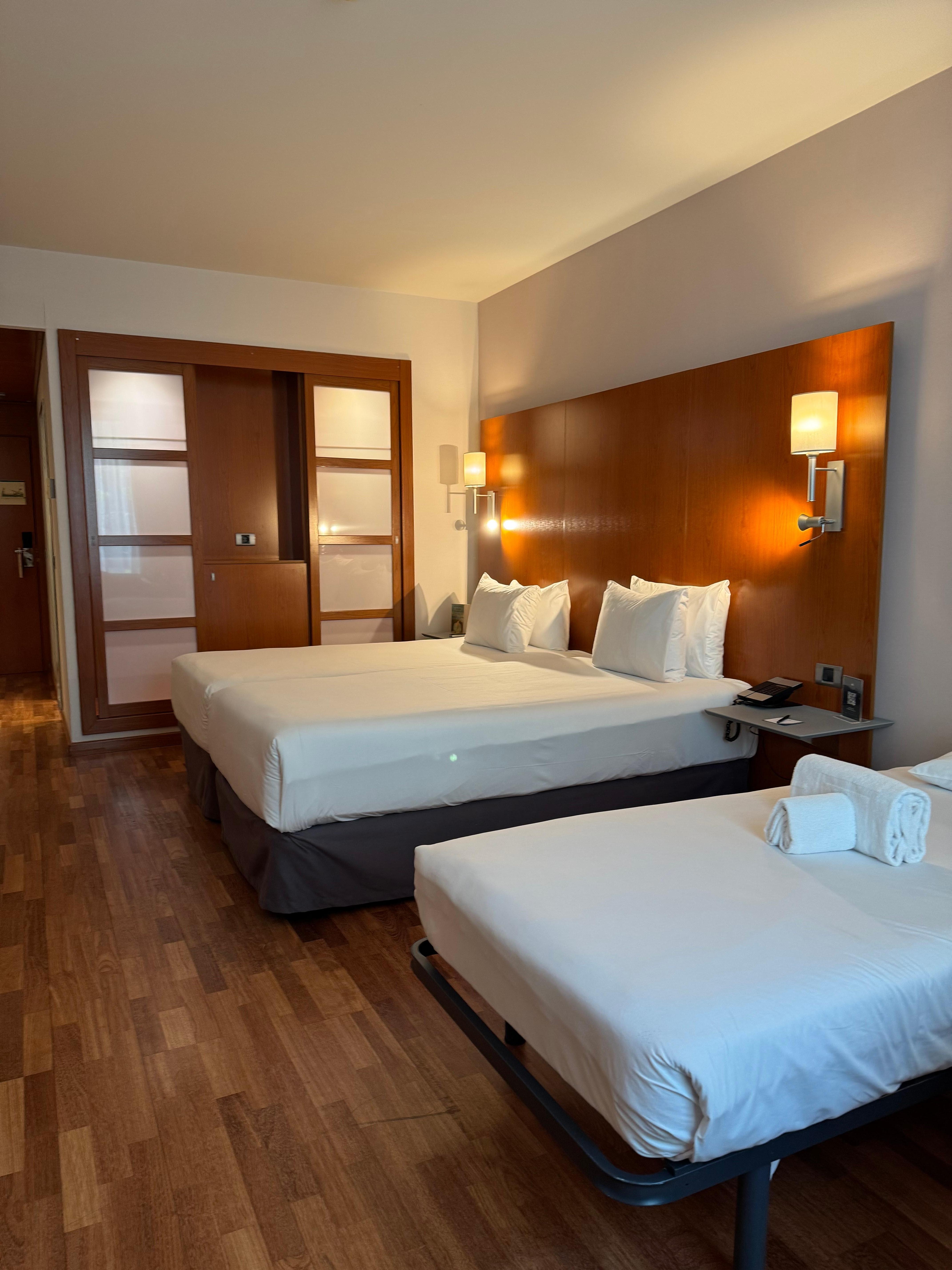 Location 10 minute to Liberty Avenue for shopping/restaurants/tours and 5 miles (but 30 minute drive) to airport. Towels were thin. Hairdryer, body soap, shampoo, conditioner and body lotion in pump bottles in the bathroom. Mini fridge, safe/vault and closet/drawers. Room was very clean, bed just ok. Staff was friendly - nice surprise that when we arrived early with a room immediately available. Morning housekeeping only allowed 1 roll toilet paper when I asked for two rolls (odd). Biggest disappointment was our room was SO HOT. Early November outside was in the low 70s F (22-24 Celsius) but the room was much hotter. After first night sweating, I asked the front desk to look into this issue or relocate our room. Told maintenance fixed the issue. Although it was not as hot the next two nights of our stay, it was never cool in the room. We tried sleeping with the window open, but it was too loud outside. In fairness, when we checked out I told the person at the desk again that AC never worked and they comped my 4 breakfast charges. However, a frustrated guest also in the lobby at the same time said he was changing hotels because his room was too hot. Door to bathroom is terrible - smoked glass that does not have a door knob (swinging door) providing little privacy. Breakfast was good - lots of options for only €12/person/day. Great restaurant in walking distance called Lidia. We did not use parking lot or gym, so can’t comment on that. Stayed at Eurostars in Madrid - better!