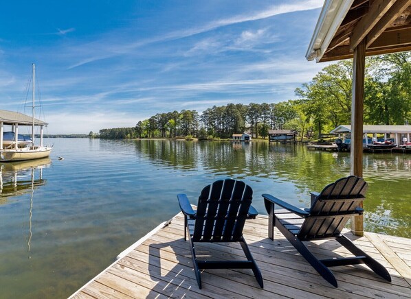 *Large boathouse with slip and room for at least two boats, plenty of seating & small refrigerator