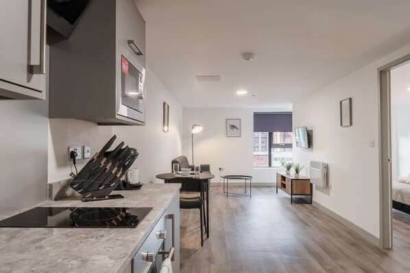 This modern apartment has been finished to a high standard with comfortable furnishings and modern appliances throughout. The open plan living space comprises a modern fully equipped kitchen with everything you need to cook your own meals at home, a dining table, sofa and smart Tv. There is high speed broadband throughout the apartment. The bedroom features a comfortable double bed made up with crisp hotel linen, as well as storage space for clothes. The modern bathroom has a shower and bath, toilet and sink, as well as complimentary toiletries with fluffy towels for your use. There are paid laundry facilities in the common space.