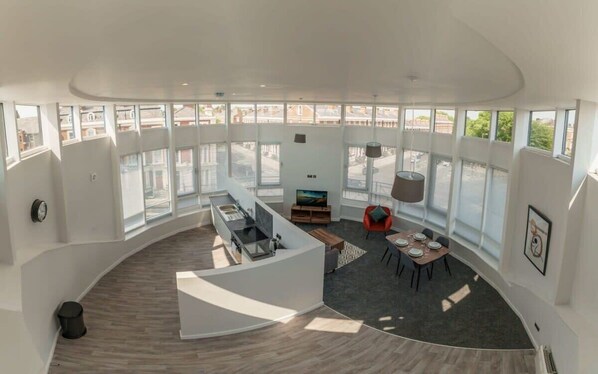 A modern and spacious apartment that has been finished to a high standard with comfortable furnishings and contemporary appliances throughout. The stunning circular living space features dozens of windows, bathing the double height room in natural light. The space comprises a modern fully equipped kitchen with everything you need to cook your own meals at home, a dining table, sofa, and smart Tv. There are 2 double bedrooms, both with comfortable beds made up with crisp hotel linen and plenty of storage for clothes and belongings. The modern bathroom has a shower, toilet and sink, as well as complimentary toiletries with fluffy towels for your use. There is also free parking on site.