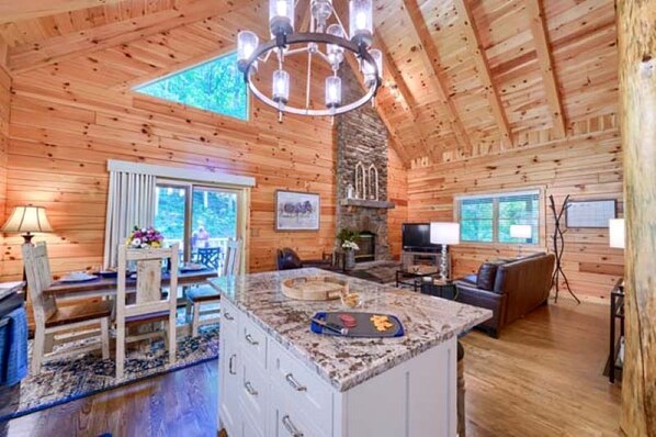 Take time to enjoy the well-equipped kitchen, charcoal-covered park grill, and large outdoor fire pit with seating. Complimentary WiFi, satellite TV, and landline are available. Relax in the evenings in front of the stone wood-burning fireplace or take a long soak in the Jacuzzi hot tub. This is a perfect retreat for a small family or a romantic getaway for two.