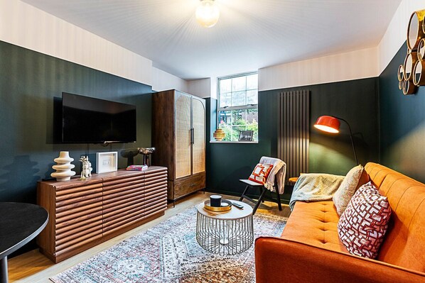 Located in London’s vibrant Spitalfields area, this stylish apartment offers a retro and eclectic space blending modern and mid-century elements. With its beautifully dark green tiled kitchen, artistic decor, smart TV, shared garden space with outdoor furniture perfect for relaxation.