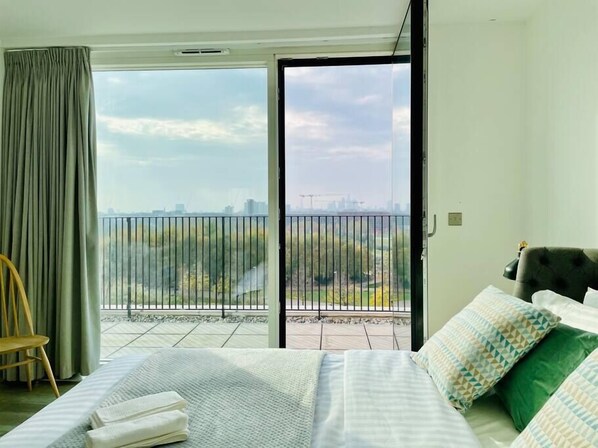 The Space: This new-build is as stunning as the pictures suggest. Both bedrooms come with a luxurious upholstered King size bed and have direct access to the private balcony with views across the entire Olympic Park and the City of London. One of the bedrooms has a newly installed office desk (pics to follow), to make working remotely extra confortable. Fast Wifi is of course included free of charge.