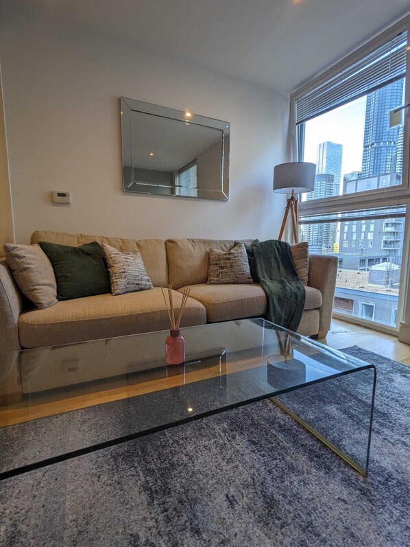Comfortable long sofa allows one additional guest. 2-min walk to the riverside Restaurants, cafés, and supermarkets right outside the building 24/7 security blackout blinds City views Air fryer Washing Machine Supermarkets short walk away take a stroll along the river Thames 5 minutes walk away.