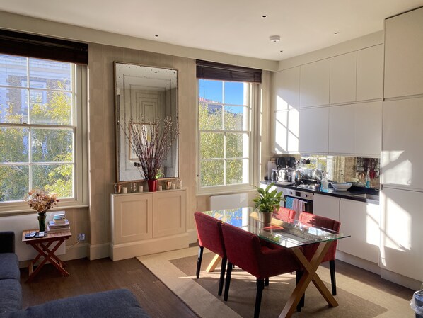 Suiutable for up to 2 adults (and 2 older children on temporary futons on living room floor at night). Not suitable for younger children eith stivku ginfers ss the furnishings sre notvmachine washsble.The Living Room is light and airy with full height windows with views over the quiet leafy street. It includes Wi Fi, Stereo, Apple TV, and a newly installed and fully equipped kitchen. There are bookshelves filled with interesting books including guides and books about London, a huge sofa, a large glass dining table for 6, and the subtle lighting is all on dimmers. There is a marble shower room with WC. The bedroom has a queen size bed, and spacious integrated hanging cupboards and shelves. Two single futons for older children are available to put on the floor of the living room.