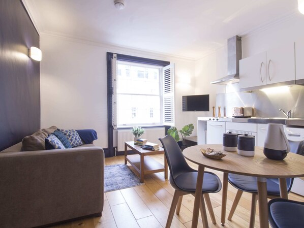 - Fully equipped open-plan kitchen with electric hobs